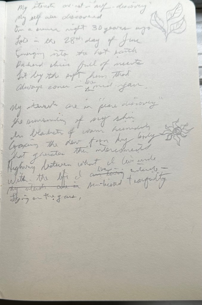 my interests are not in "self-discovery". my self was discovered on a summer night 30 years ago, late in the 28th day of June, emerging into the hot earth darkened skies full of insects, lit by the soft hum that always comes in the mid-year. my interests are in "peace-discovery". the surrounding of my skin in the blankets of warm humidity, coaxing the dew from by body that generates the interconnected highway between what I live inside with the life I live outside - lying on the grass sun-kissed tranquility.